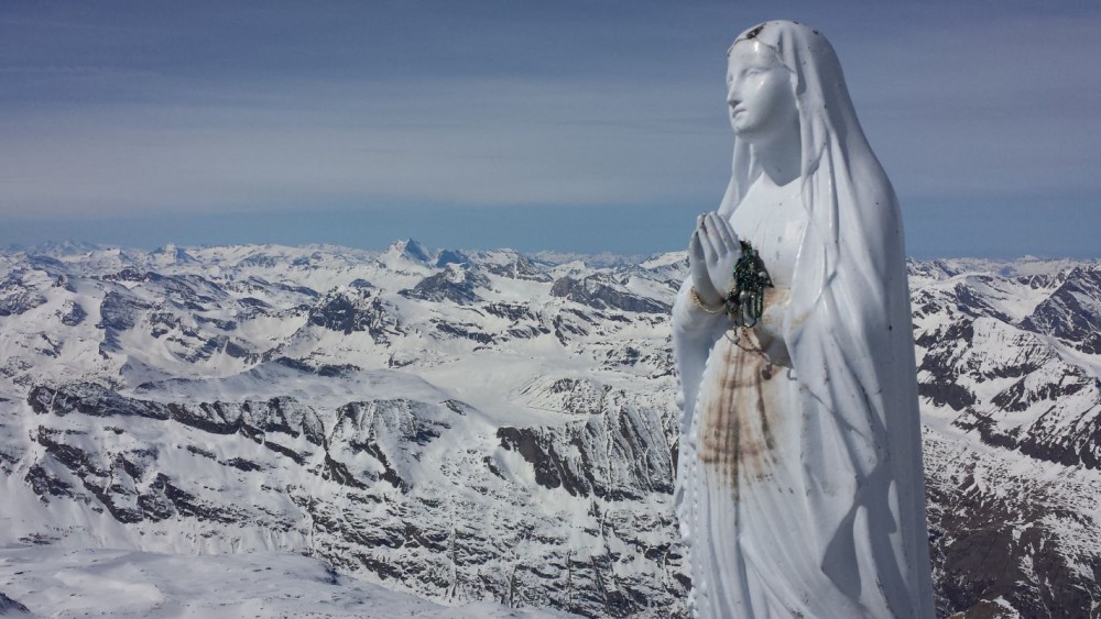 Zuletzt geht es über ein Schneefeld bis kurz unter den Gipfel. Hier muss man definitiv abschnallen und die letzten Meter zum Gipfel und der Madonna hinaufklettern. Aber auch, wer sich das Klettern ersparen will, hat unterhalb des Gipfels einen wunderschönen Rundumblick auf die umliegenden Gipfel…die meisten niedriger als der Gran Paradiso. Ein wirklich atemberaubender Anblick. Traumhaft!
