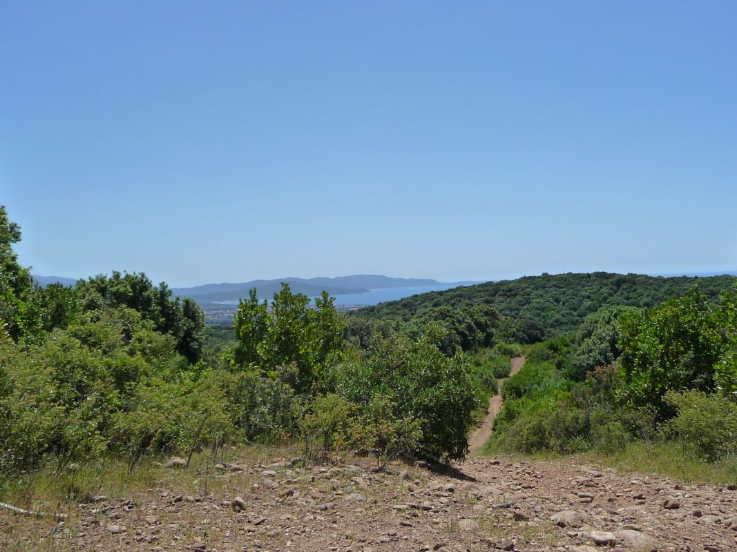 Der Weg führt erst über Straße, dann hauptsächlich über Schotter- und Waldwege. Immer bergauf- bergab, mit schönen Blicken in die Wälder, teilweise bis zum Meer.