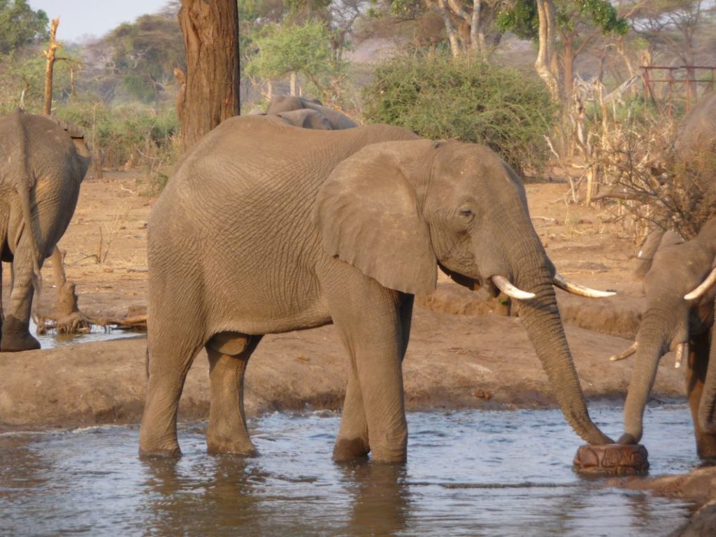 Die Lodge liegt direkt an einem Wasserloch. Schon bei der Ankunft tranken 4 Giraffen gemütlich ihren „Nachmittagstee“…nur kurze Zeit später erschien eine große Elefantenherde, die sich genüsslich im Wasser tummelten.