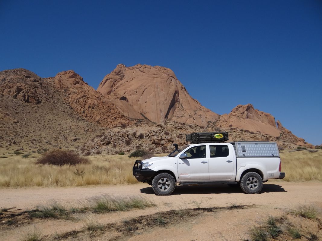 Namibia44In Windhoek haben wir aufgetankt und unsere Vorräte aufgestockt, denn ab hier ging es in die Namib Wüste. Die Gegend sieht ganz anders aus als im Norden von Windhoek. Bergiges Land und sehr schöne Felsformationen wechseln sich mit Steppenland ab. Trotz mancher Wasserdurchfahrten ist die Strasse eine Autobahn im Vergleich zu Botswana.