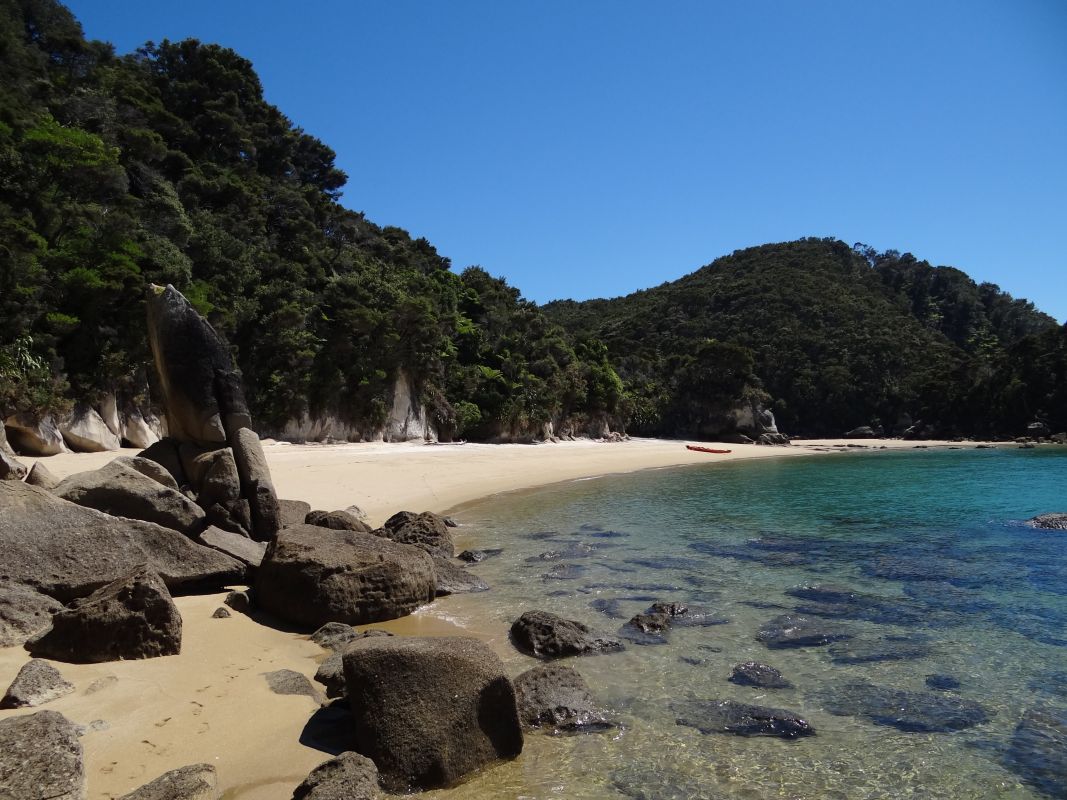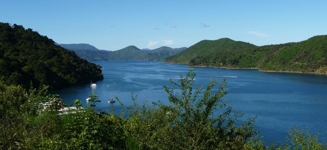 Wir sind mit dem Boot von Picton aus über den Queen Charlotte Sound zur Resolution Bay gefahren – eine Station vor Ship Cove. Von da aus ging es 10 km am Sound entlang bis zur Furneaux Lodge. Der Weg führt durch Regenwald und Farne, mit wundervollen Blicken auf den Sound.