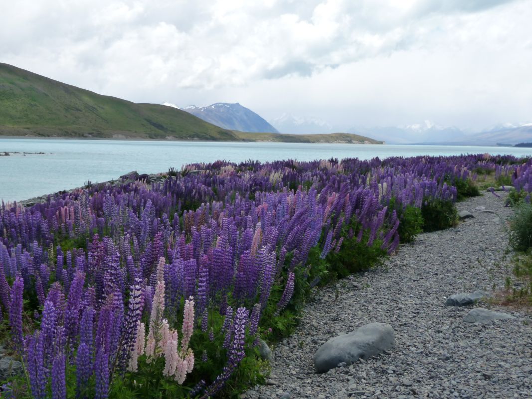 Am Lake Tekapo sollte man bei schönen Wetter ruhig etwas Zeit zum bummeln oder einfach nur staunen einplanen. Die unglaubliche Blütenpracht, unterstützt von einem ganz intensiven Duft, und das Türkis des Sees suchen seines Gleichen. Hier gibt es auch Cafés und Restaurants mit einem wunderbaren Seeblick.