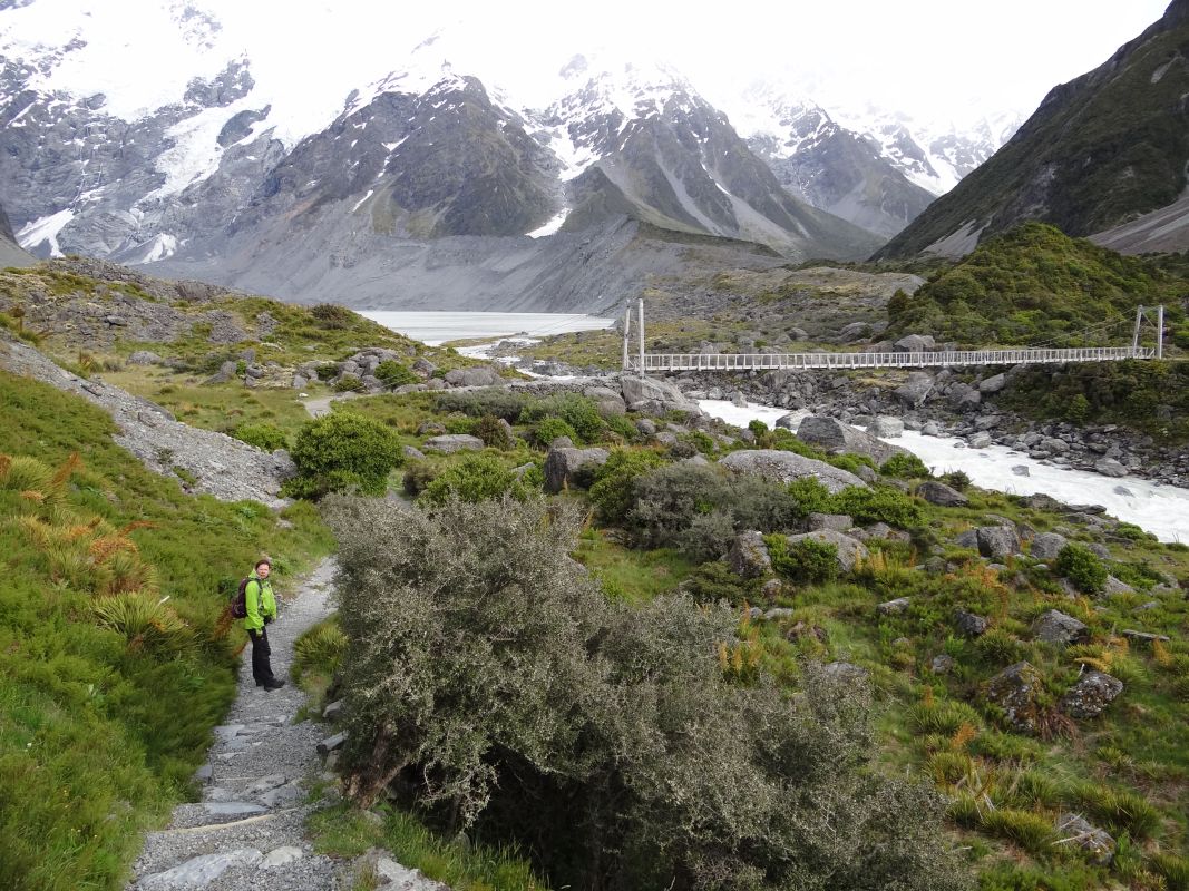 Aufgrund der Wettervorhersage haben wir uns für eine 3-stündige Wanderung zum Hooker Gletscher entschieden. Der Weg führte uns über Hängebrücken, immer am Fusse des Mount Cook entlang. Auf dem Gletschersee befanden sich einige pittoreske Eisschollen. Hätte die Sonne geschienen, wären es malerische Anblicke gewesen.