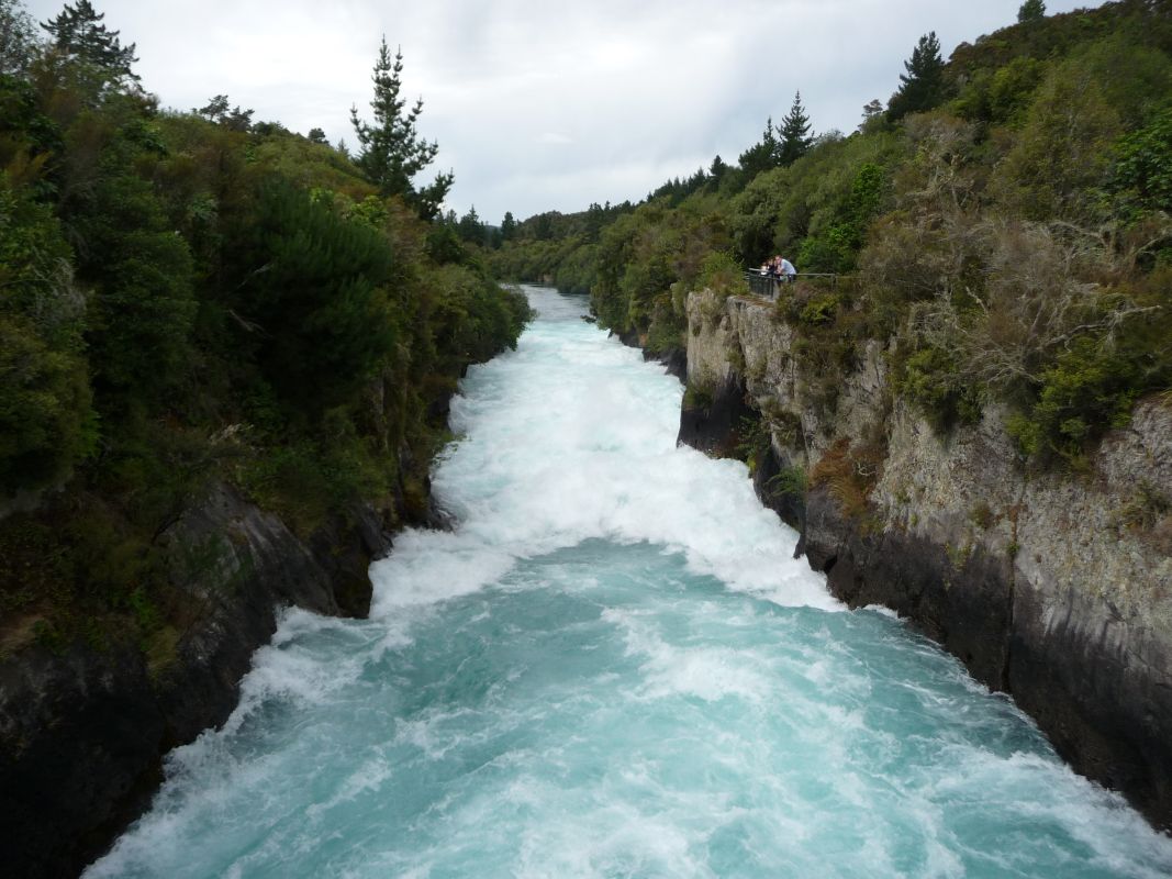 Über einen kleinen Umweg kamen wir an den Huka Falls vorbei. Der 100 m breite Waikato River verengt sich hier auf 15 m. Durchschnittlich 140.000 Liter Wasser stürzen sich pro Sekunde die Felsen hinab. Es ist ein beeindruckendes Naturschauspiel.
