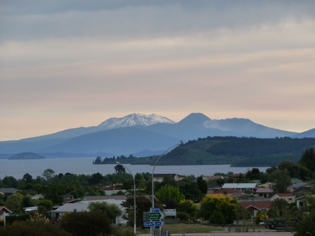 Vom Lake Taupo aus hat man einen wunderbaren Blick auf die Vulkankegel des Tongariro Nationalparks. Es handelt sich dabei um die Vulkane Tongariro (1968 m), Ngauruhoe (2291 m) und Ruapehu (2797 m).