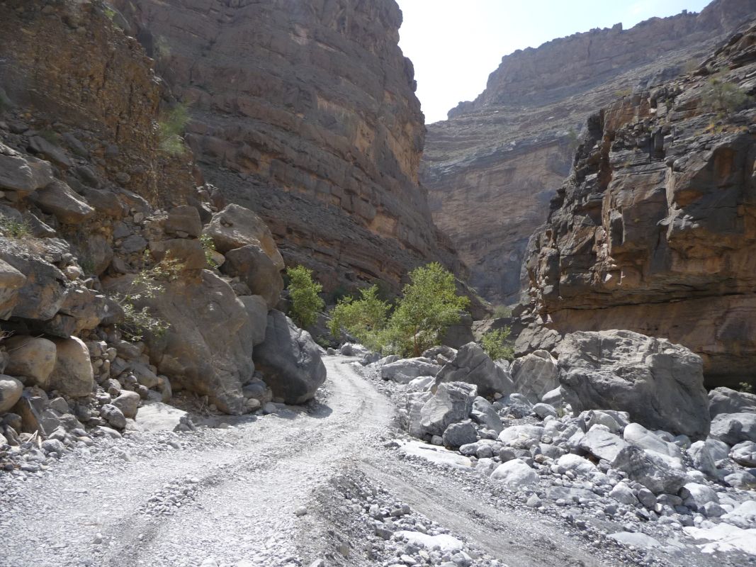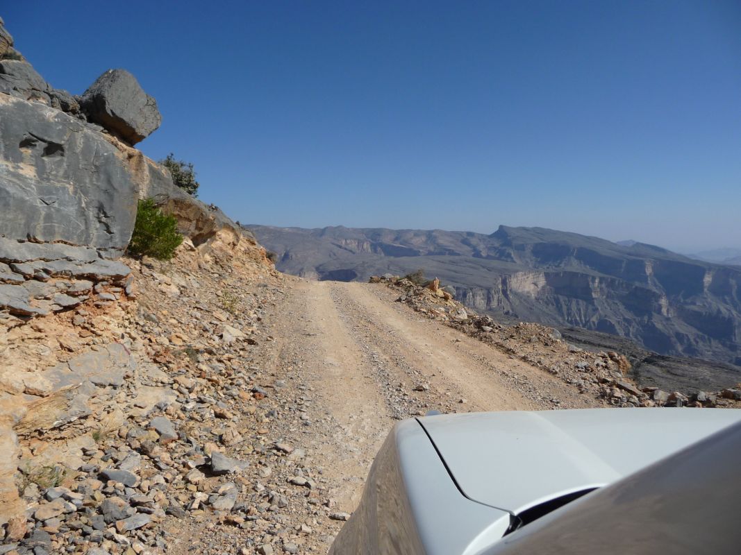 Die Strasse nach Jebel Akhdar bzw. dem Saiq-Plateau ist nur für Allrad-Fahrzeuge erlaubt. Ein Permit ist nicht mehr notwendig, allerdings kontrolliert das Militär am Anfang der Strasse den Pass, den Führerschein und die Kopie der Wagenpapier. Dann geht eine Asphaltstrasse steil bergauf ins Gebirge.