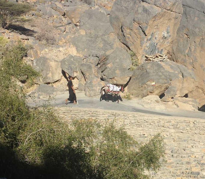 Oman17Der Rückweg ist die ersten 13 km der selbe Weg, dann gelangt man an eine Kreuzung. Wir sind nach rechts abgebogen und gelangten nach kurzer Zeit wieder auf eine Asphaltstrasse. Von da aus fuhren wir über Al Hamra in das Bergdorf Misfah, dem angeblich schönsten Bergdorf Omans. Im alten Ortsteil hat man das Gefühl, dass die Zeit stehen geblieben ist. Die alten Häuser und herumlaufenden Esel lassen die Uhren langsamer ticken.