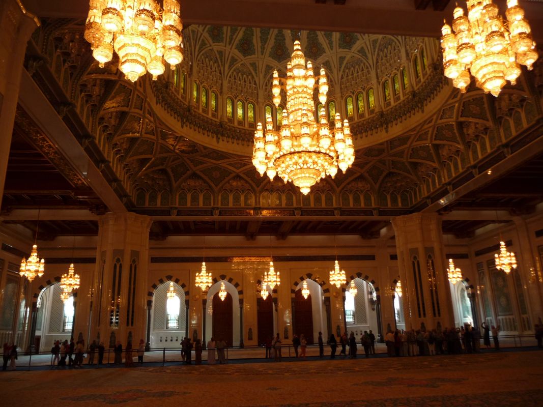 Oman212Oman210Auf dem Boden der Moschee kann man sein Spiegelbild erkennen. Das ist kein Witz. Der Teppich im großen Gebetsraum ist 4.000 qm groß. Desweiteren befindet sich im Gebetsraum ein 8 m hoher Leuchter von Swarowksi, der höchste Leuchter weltweit. Mich hat das Gebäude schon sehr fasziniert und begeistert.