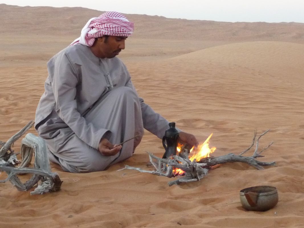 An Ort und Stelle zündete Rashid noch ein kleines Lagerfeuer an und kochte omanischen Kaffee. Dazu gab es Datteln. Des war toll.