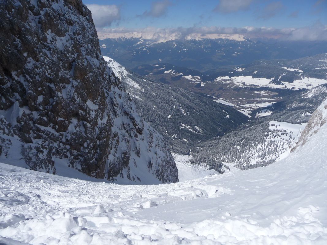 Die Abfahrt ging über die Aufstiegsspur. Oberhalb der Baumgrenze hatten wir super Tiefschnee, teilweise unverspurt. Sobald es in den Wald ging, war schon etwas Können gefordert – die Strecke war sehr ausgefahren und ein paar Bäume standen auch im Weg.