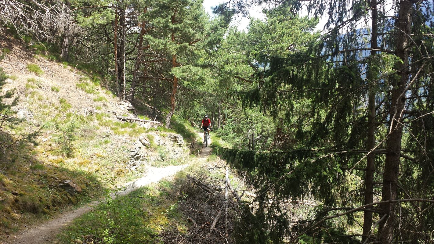 Von Mals aus geht es über die Radwege nach Glurns. Eine Strasse steil bergauf führt in den Wald und ab hier fährt man nur noch Trails …immer bergauf und bergab.
